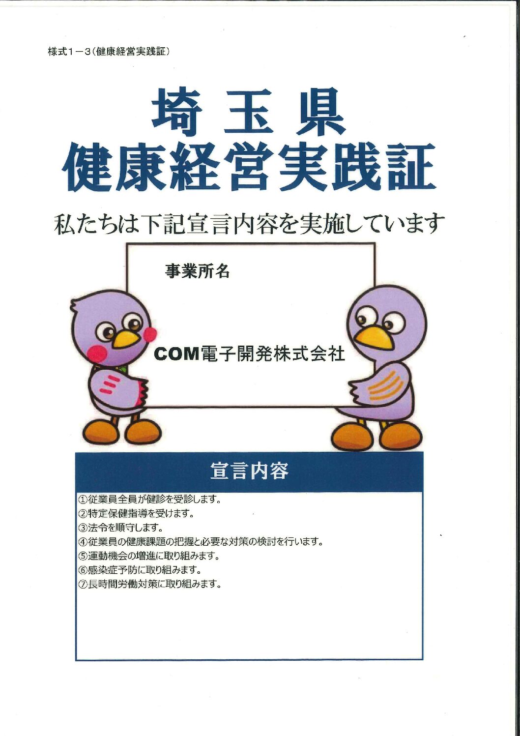 当社の本社工場が埼玉県健康経営認定制度の健康経営実践事業所に認定されました